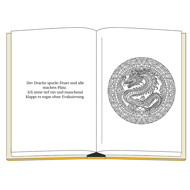 Hier siehst du, wie eine typische Doppelseite aussieht: links der Spruch, rechts das Mandala. Keine Erklärung, keine langen Texte — nur dein Stift und ein kurzer, sarkastischer Kommentar zur Lage.